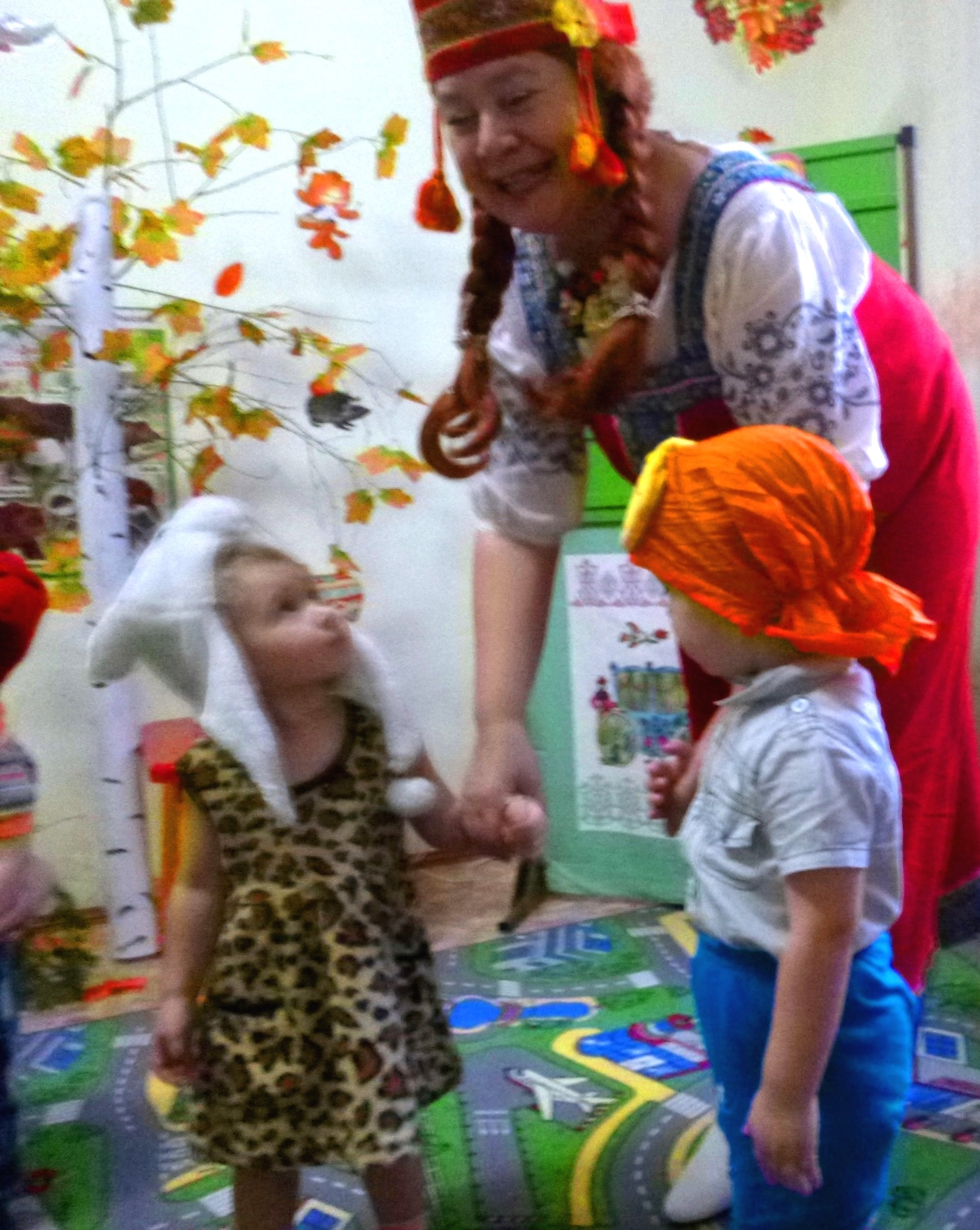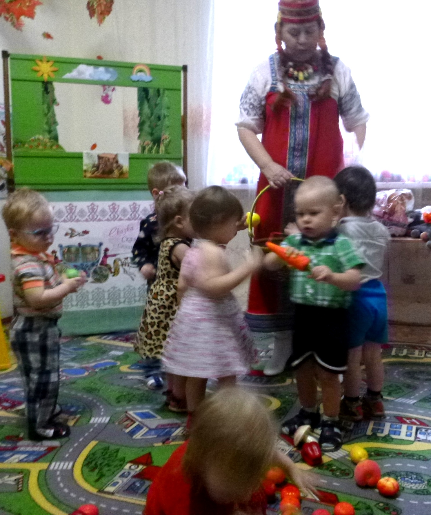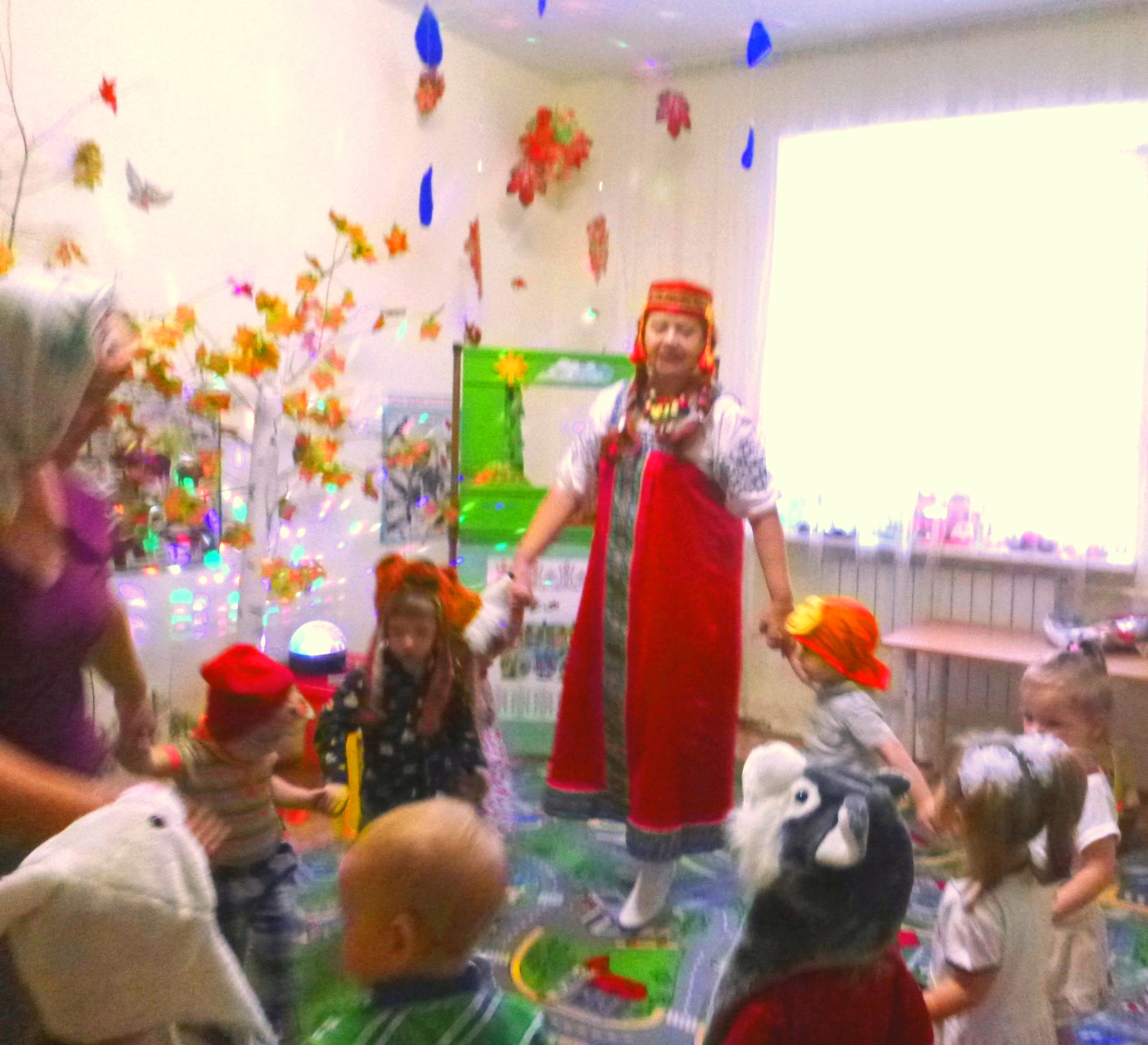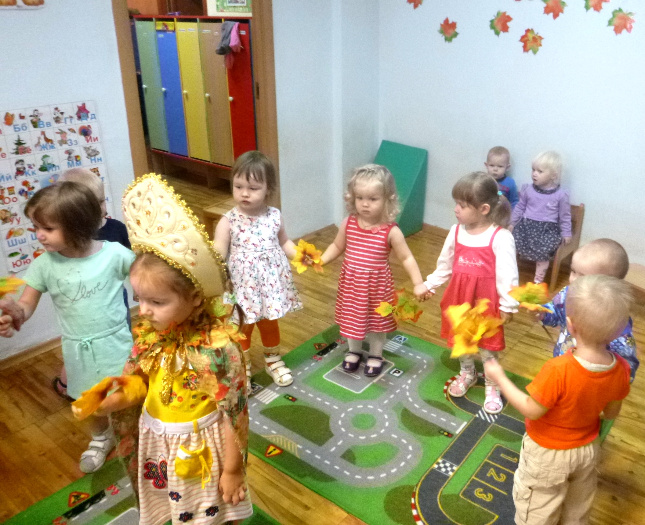 А потом, еще неуверенно, брались за ручки и водили хороводы. Но вот вдруг появлялась Золотая осень, это самая бойкая девчушка облачалась в кокошник и «плащ» с осенними листьями. Всем деткам тоже достались веточки с желто-багряными листочками и начался танец «Я с листочками хожу». Все с удовольствием танцевали. А потом была игра «Солнышко-Дождик». Под песенку о солнышке малыши прыгали, кружились. Когда же начиналась песенка про дождик детишки бежали под яркий зонтик к Марье Искуснице. В завершении праздника ребятки собирали для лесных зверушек плоды осени: фрукты, овощи, грибы в корзинку.