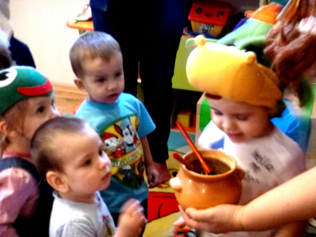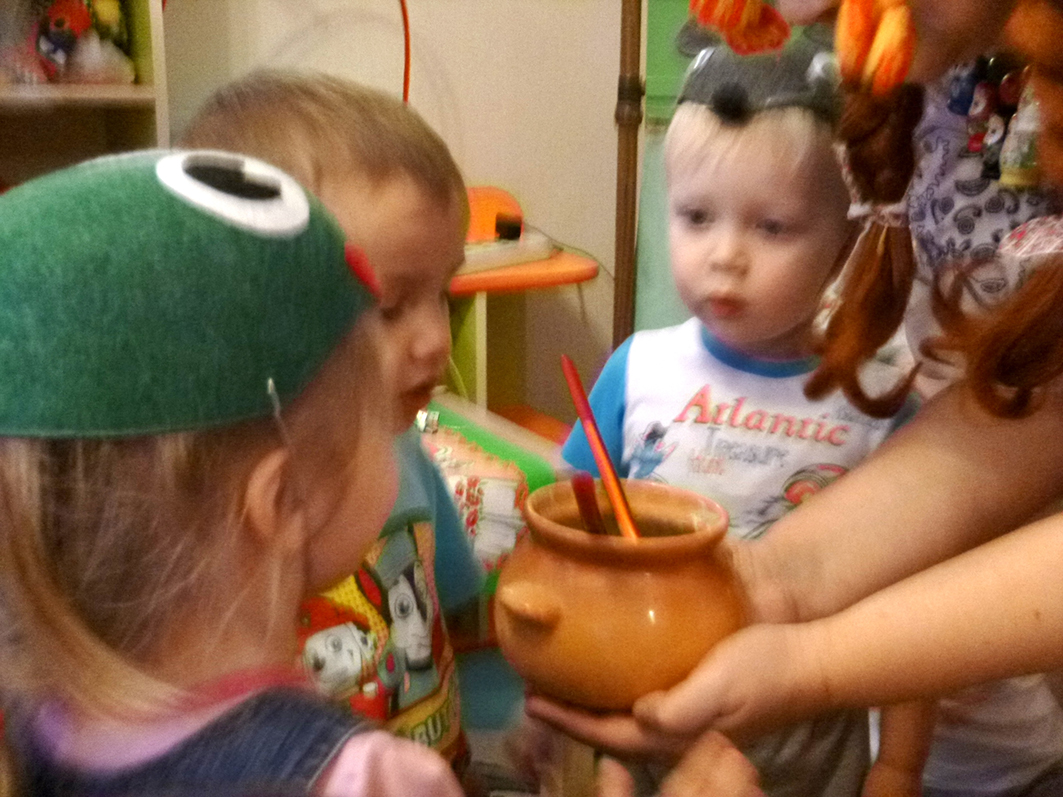 Вот Марья Искусница и решила внести свою лепту в этот воспитательный процесс. Я принесла глиняный горшок, рассказала малышам, что в нем варили кашу, русские щи, парили репу и месили тесто, как сказочная Мышка-норушка. Ребятки, облаченные в шапочки персонажей из сказки, размешивали деревянными ложками «квашню» в глиняном горшке.