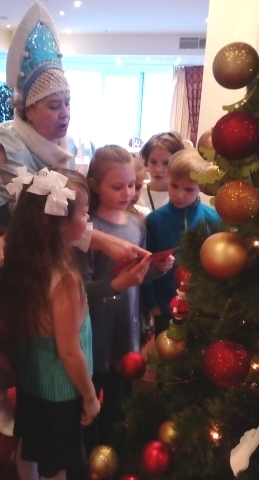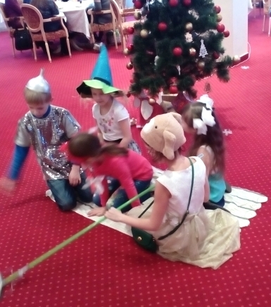 В нашем репертуаре уже есть два квеста для этой аудитории ( см. репертуар, новости). Наш коллектив создал новогодний сценарий «Как Бастинда похитила Деда Мороза» по мотивам одного из квестов и провел эту программу в чудесном, ярко декорированном зале ресторана «Онегин». Злая Волшебница обманом заманила Деда Мороза и приковала цепью к клетке, где в оригинале сказки сидел Лев. Дети в разгар игр у елки узнают из письма о коварстве Бастинды. Так «завязывается» сюжет. Не буду описывать весь сценарий. Целью школьников, на время превратившихся в Элли и ее друзей, и Бастинду, было преодолевая препятствия, освободить Деда Мороза из плена. После чего спасатели танцевали с Дедушкой вокруг елки и получали подарки.