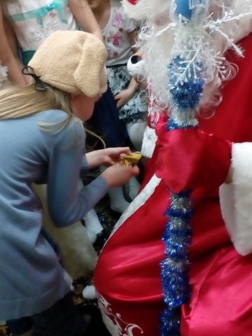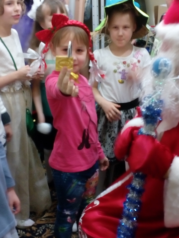Не могу сказать, что все участники праздника активно включились в игру. Был один человек, который, напустив на себя скепсис и равнодушие, начал отвлекать остальных, своим «игривым» поведением (хихикал, заворачивался в плед и т.д). Но остальные школьники, в основном девчонки, приняли игру и активно выполняли все задания. А мальчик из скептиков, вероятно, боровшийся со своими внутренними противоречиями, преодолев себя, все-таки пришел рассказать Деду Морозу новогодние стихи. И тут я увидела наивный, детский взгляд его серо-голубых глаз.
