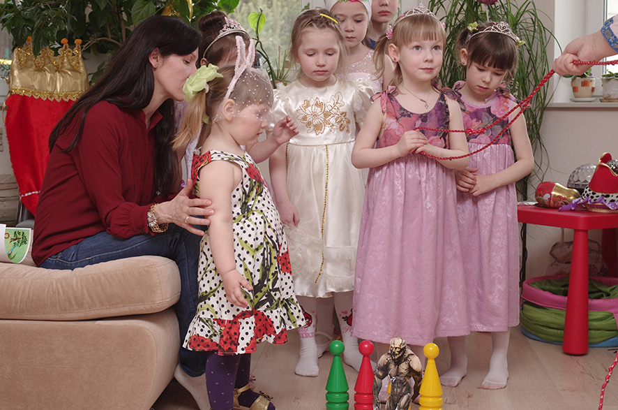 В первой части праздника происходило посвящение в Принцессы: коронация. Девочек за ручки вели отдельно: одну – папа Король, другую – мама Королева! Каждую девочку усаживали по очереди на трон и возлагали на юную головку Корону. Все происходило под чудесную музыку о принцессах, пришедших на бал.