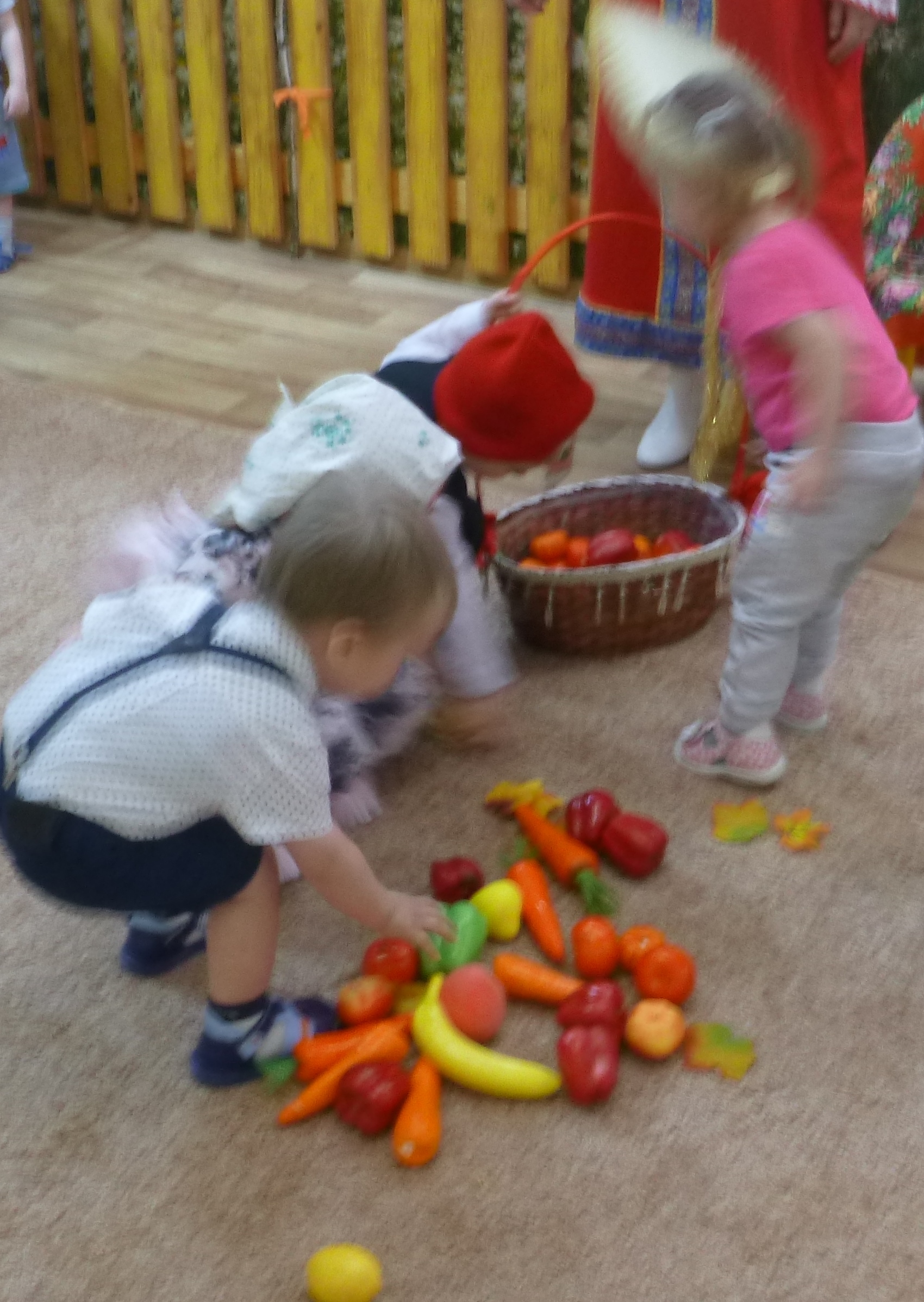 А, затем, детки под музыку водили хоровод в шапочках-масках персонажей «Колобка». Среди них была «Осень», правда, костюм пришлось разделить на две части: девочке понравился «золотой» кокошник, а мальчику – плащ осени с листьями. В завершение выступления, все дружно собирали осенние листья, дары осени – овощи и фрукты, и фотографировались.