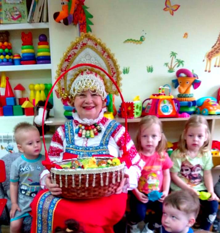Марья Искусница рассказывает совсем маленьким деткам в доступной форме об Иисусе и его добрых делах, о Пасхе, показывает в корзине яркие крашеные яйца, кулич и желтенького цыпленка.